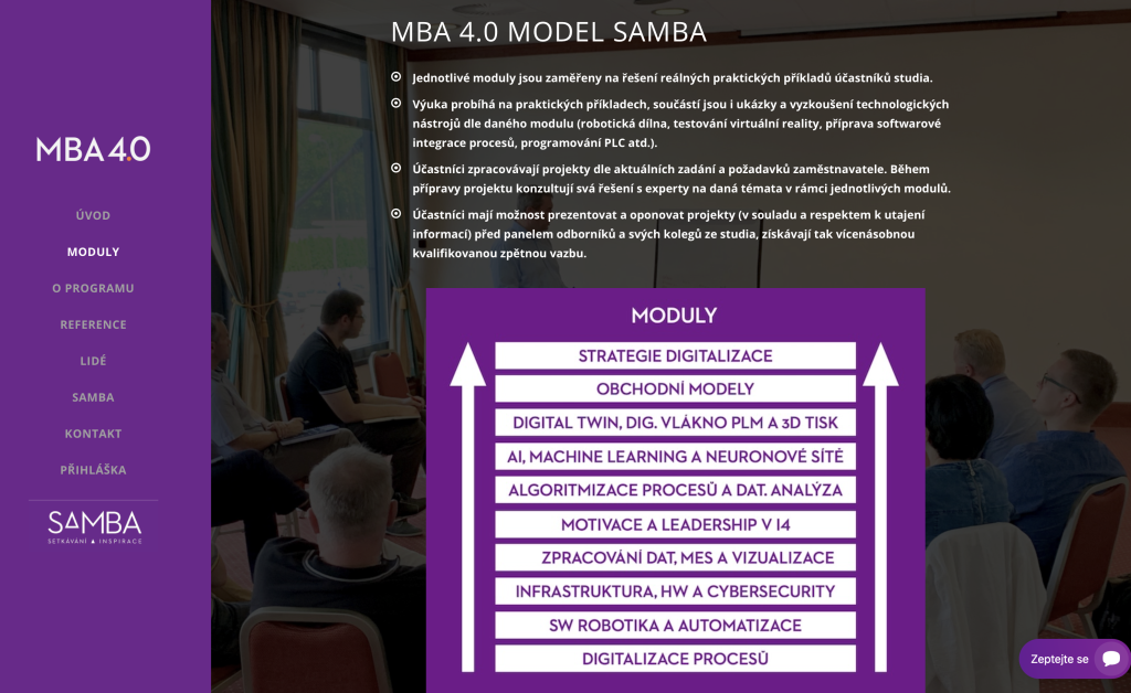 Výstupy: po každém modulu projekt využitelný v praxi; závěr: obhajoba závěrečné práce → MBA diplom.